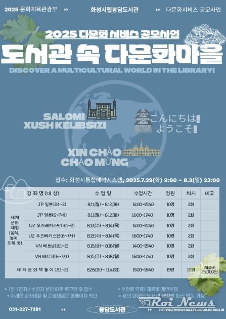 [ 로이뉴스(Roi News) 이지수 기자 ] 화성시문화관광재단 운영 봉담도서관과 사자와어린양작은도서관에서 오는 8월부터 ‘도서관 속 다문화마을’ 프로그램을 개최한다.