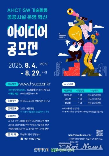 [ 로이뉴스(Roi News) 이지수 기자 ] 화성도시공사는 오는 8월 4일부터 29일까지 ‘AI·ICT·SW 기술을 활용한 공공시설 운영 혁신 아이디어 공모전’을 개최한다고 밝혔다.