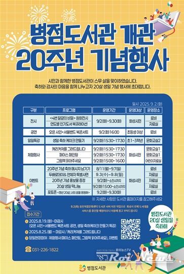 [ 로이뉴스(Roi News) 이지수 기자 ] 화성시문화관광재단(대표이사 안필연)에서 운영하는 화성시립 병점도서관은 오는 9월 1일 개관 20주년을 맞아 시민 누구나 즐길 수 있는 다채로운 기념 행사를 준비했다.
