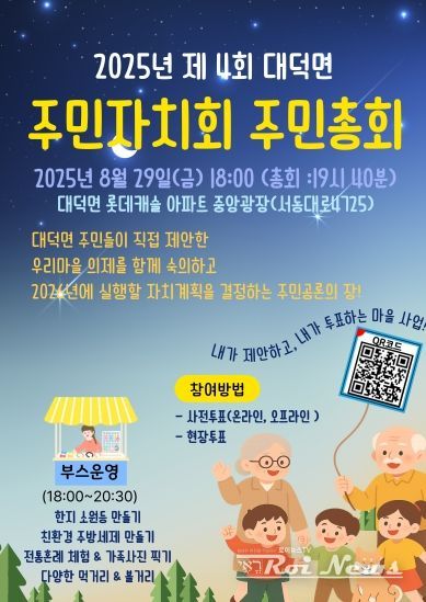 [ 로이뉴스(Roi News) 이지수 기자 ] 대덕면 주민자치회는 오는 8월 29일 오후 6시, 롯데캐슬아파트 중앙광장에서 개최되는 ‘2025년 제4회 대덕면 주민자치회 주민총회’를 앞두고, 주민 누구나 쉽게 제안 사업 투표에 참여할 수 있도록 사전투표를 활발히 진행 중이다.