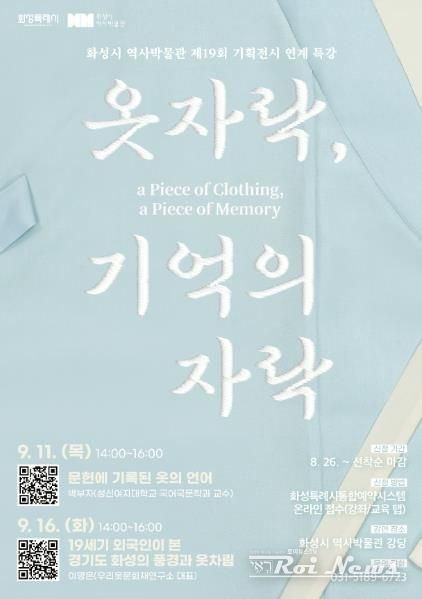 [ 로이뉴스(Roi News) 이지수 기자 ] 화성특례시가 다음 달 11일과 16일 오후 2시에 화성시 역사박물관에서 제19회 기획전시 ‘옷자락, 기억의 자락’과 연계한 특강을 운영한다.