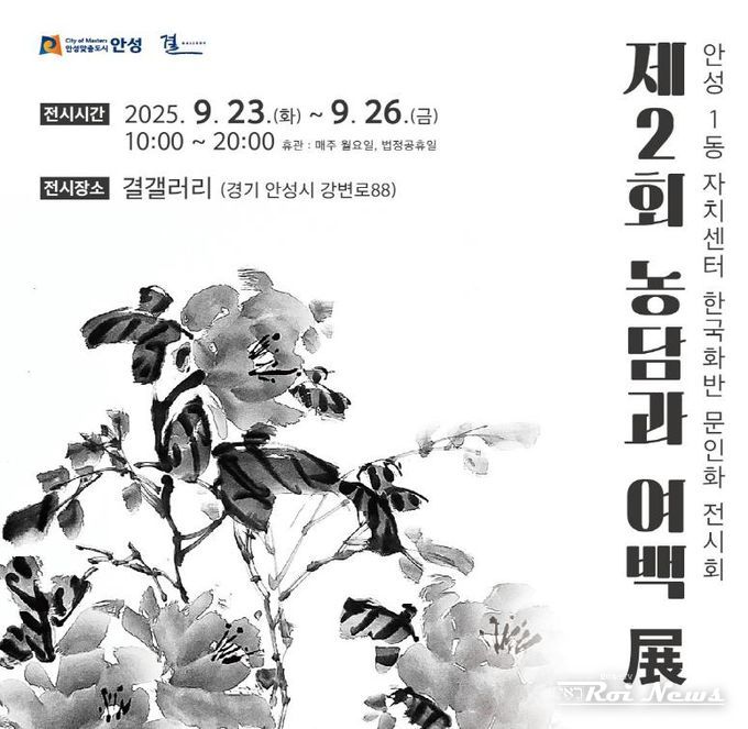 [ 로이뉴스(Roi News) 이지수 기자 ] 안성1동 자치센터 한국화반은 오는 9월 23일부터 9월 26일까지 안성천 작은미술관 결갤러리에서 ‘제2회 농담과 여백전’을 개최한다.