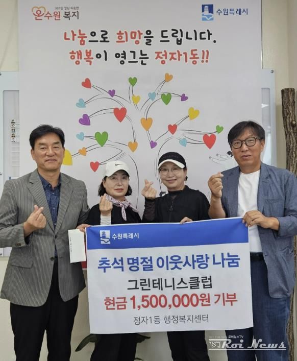 [ 로이뉴스(Roi News) 이지수 기자 ] 수원시 장안구 정자1동은 그린테니스클럽이 지난 23일, 추석 명절을 맞아 관내 취약계층을 돕기 위해 현금 150만 원을 기부했다고 밝혔다.