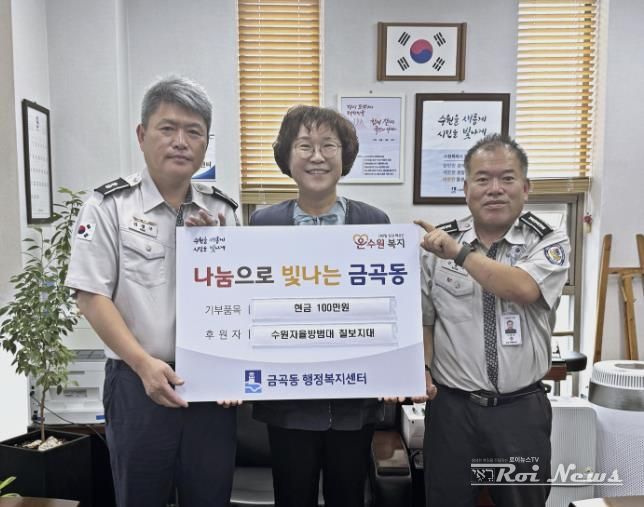 [ 로이뉴스(Roi News) 이지수 기자 ] 수원시 권선구 금곡동 행정복지센터은 지난 23일, 수원자율방범대 칠보지대에서 일일호프 행사로 마련한 성금 100만원을 전달했다고 밝혔다.