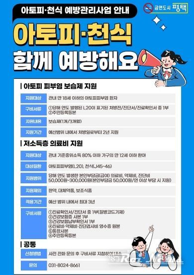 현재 보습제 지원이 필요한 참여자를 모집 중이다. 참여를 희망하는 시민은 안중보건지소 아토피 사업(031-8024-8661)으로 문의 후, 주민등록등본과 질병코드(L20)가 기재된 처방전을 지참해 방문 신청하면 된다.