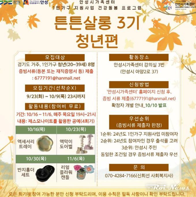 [ 로이뉴스(Roi News) 이지수 기자 ] 안성시가족센터는 1인 가구 청년층을 대상으로 ‘건강돌봄 프로그램 – 튼튼살롱 3기’ 참여자를 모집한다.