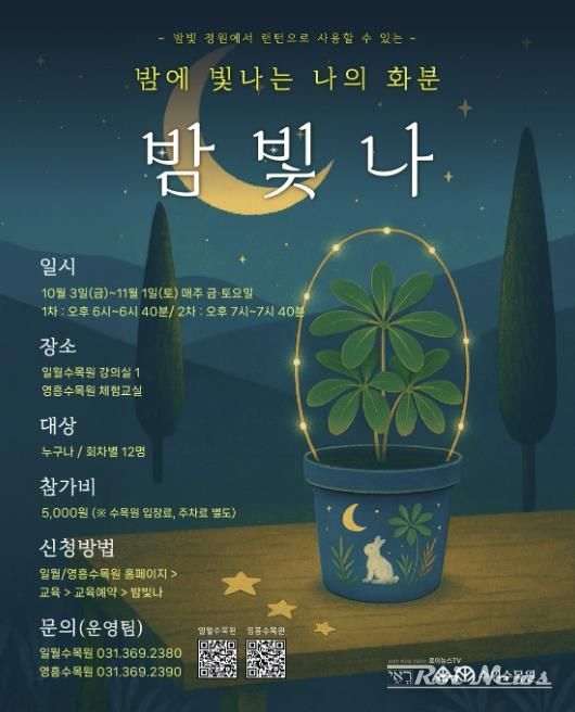 [ 로이뉴스(Roi News) 이지수 기자 ] 수원특례시는 일월·영흥 수목원에서 10월 3일부터 11월 1일까지 매주 금·토요일 야간에 열리는 행사 ‘밤빛정원’에서 다양한 체험 프로그램들을 운영한다.