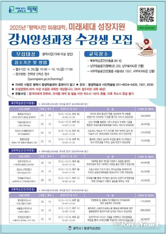 [ 로이뉴스(Roi News) 이지수 기자 ] 평택시는 오는 10월 13일부터 12월 19일까지 10주간 '2025년 평택시민 미래대학' 미래세대(아동·청소년) 성장지원 강사 양성 과정을 운영한다고 밝혔다.