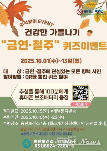 퀴즈를 완료한 참여자 중 정답자 100명을 추첨해 금연 홍보물(보조배터리)을 증정하며 당첨자는 10월 15일 개별 문자로 안내된다. 상품은 10월 16일부터 22일까지 송탄보건소 1층 헬스케어상담센터 내 금연클리닉에서 수령할 수 있다.