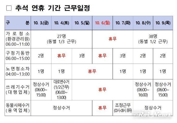 10월 3일부터 9일까지 이어지는 이번 추석 연휴 기간 중 발생되는 적치 쓰레기를 해소하고 청소 관련 민원을 신속하게 처리하기 위하여 동별 청소 인력 배치 및 청소 기동반 운영 등 주민 불편 최소화에 초점을 맞춰 추진된다.