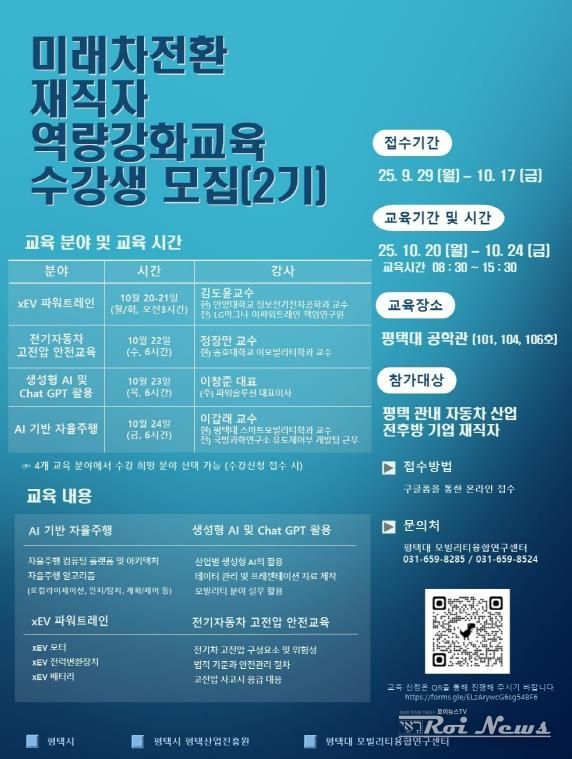 [ 로이뉴스(Roi News) 이지수 기자 ] 평택시와 평택산업진흥원이 ‘미래차 전환 재직자 역량 강화교육’ 2기 과정을 개설한다. 교육은 10월 20일부터 24일까지 교육 운영기관인 평택대학교에서 진행되며, 지역 자동차 산업 재직자를 대상으로 미래차 핵심 분야 전문지식을 제공한다.