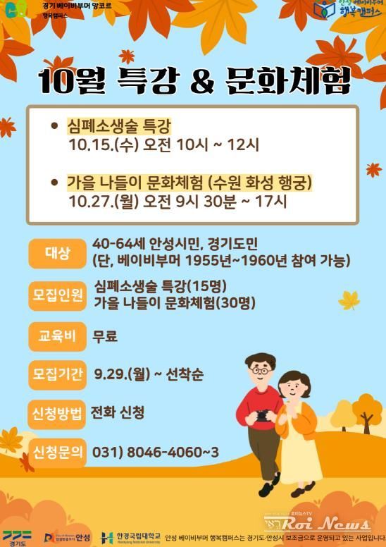 [ 로이뉴스(Roi News) 이지수 기자 ] 안성 베이비부머 행복캠퍼스(한경국립대학교 평생교육원)는 오는 10월 15일부터 27일까지 중장년 안성시민(경기도민)을 대상으로 ‘10월 특강(심폐소생술) 및 문화체험(수원화성행궁)’ 프로그램을 운영한다고 밝혔다.