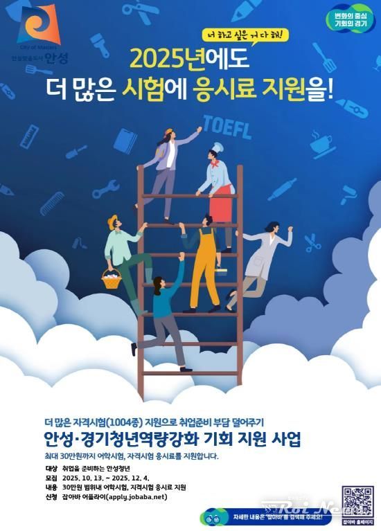 안성시 관계자는 “어학·자격시험은 취업의 문턱을 넘는 데 필수적인 과정이지만 반복 응시가 필요한 경우가 많아 비용 부담이 크다”며 “이번 추가 모집을 통해 청년들이 응시료 부담을 낮추고 실제 취업 역량을 한 단계 끌어올리는 데 도움이 되길 바란다”고 말했다.
