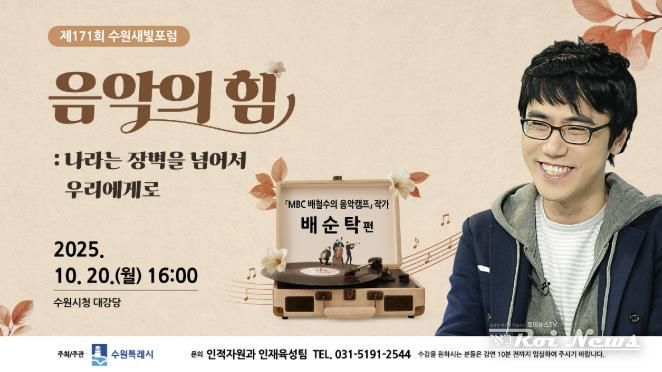 [ 로이뉴스(Roi News) 이지수 기자 ] MBC 라디오 ‘배철수의 음악캠프’ 배순탁 작가가 10월 20일 오후 4시 시청 대강당에서 열리는 제171회 수원새빛포럼 강사로 나선다.