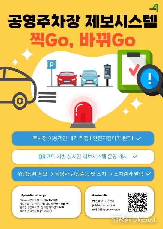 [ 로이뉴스(Roi News) 이지수 기자 ] 안성시시설관리공단은 10월 10일부터 원곡면, 석정동, 공도 저류지, 동본동(수탁예정)공영주차장 4개소 대상으로, 이용객이 직접 주차장의 위험요소나 이용 불편사항을 손쉽게 제보하고 개선에 참여할 수 있는 QR 코드 기반의 실시간 위험상황 제보시스템 “찍Go, 바뀌Go”를 운영한다고 밝혔다.