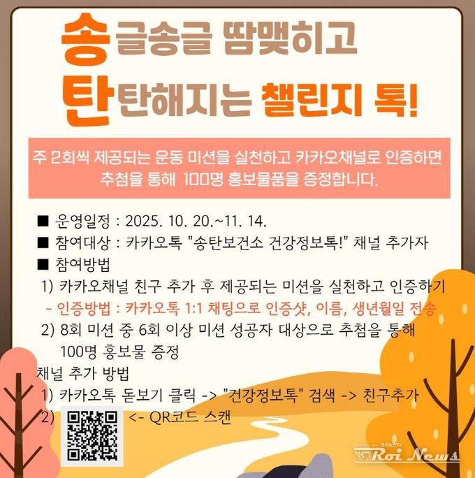 [ 로이뉴스(Roi News) 이지수 기자 ] 평택시 송탄보건소는 10월 20일부터 11월 14일까지 카카오톡을 활용한 ‘(송)글송글 땀 맺히고 (탄)탄해지는 챌린지 톡!’을 운영할 예정이라고 밝혔다.