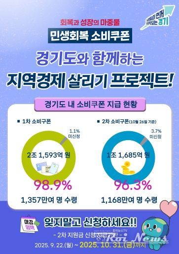 [ 로이뉴스(Roi News) 이지수 기자 ] 경기도가 민생회복 소비쿠폰 2차 지급 신청이 오는 31일 오후 6시 마감된다며 기한 내 신청을 당부했다. 기한이 지난 미신청 금액은 자동 소멸된다.