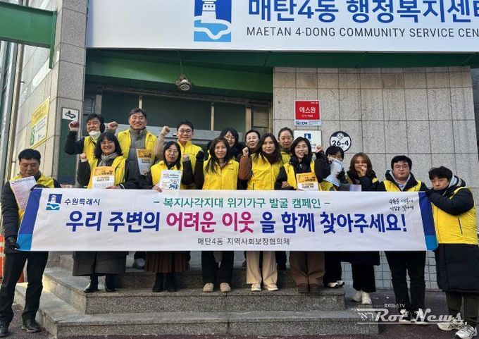 오미숙 매탄4동장은 “매탄4동 행정복지센터는 앞으로도 지속적인 위기가구 발굴 활동을 통해 동절기 복지 안전망 구축에 힘쓰겠다”며 “추운 날씨에도 캠페인에 적극 참여해 주신 지역사회보장협의체 위원님들께 감사드린다”고 밝혔다.