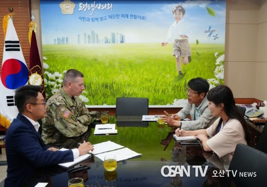 [ 오산TV 이경호 기자 ] 평택시의회 유승영 의장은 16일 시의회 의장실에서 최근 취임한 미 육군 험프리스 수비대 기지 사령관 라이언 K. 워크맨 대령(COL Ryan K. Workman)과 환담을 나눴다.