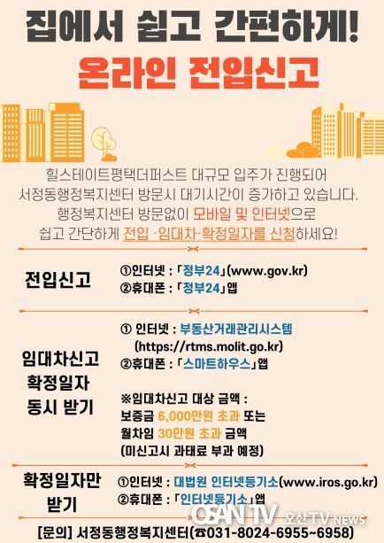 온라인 전입신고는 서정동 행정복지센터를 방문하지 않고도 인터넷과 스마트폰에서 가능하며 정부24 앱 또는 누리집에서 신청가능하다. 또한 온라인 확정일자, 임대차 신고는 스마트하우스 앱 또는 부동산 거래관리시스템에서 신청하면 된다.
