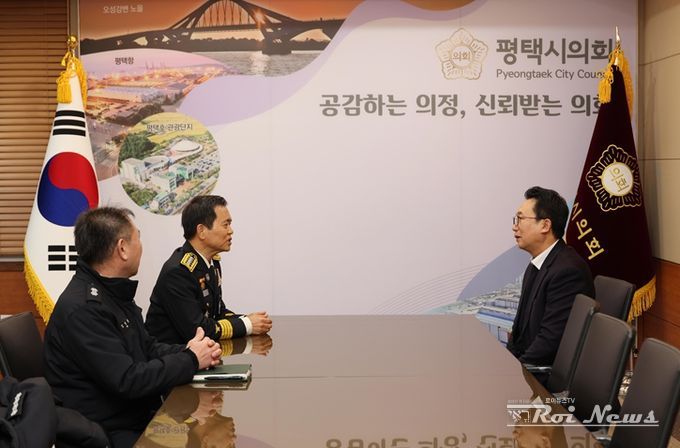 [ 로이뉴스(Roi News) 이지수 기자 ] 평택시의회 강정구 의장은 7일, 시의회 의장실에서 김승남 송탄소방서장을 접견해 시민의 안전에 대해 논의했다.