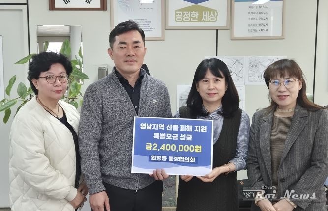 [ 로이뉴스(Roi News) 이지수 기자 ] 평택시 원평동 통장협의회는 최근 영남지역에서 발생한 대형 산불 피해로 어려움을 겪고 있는 주민들을 돕기 위해 특별성금 240만 원을 기부했다.