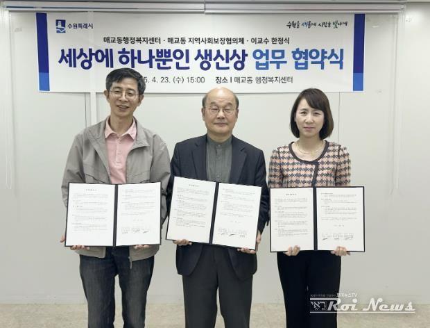 [ 로이뉴스(Roi News) 이지수 기자 ] 수원시 팔달구 매교동 행정복지센터와 매교동 지역사회보장협의체에서는 지난 23일 이교수 한정식과 ‘세상에 하나뿐인 생신상(어르신 생신상 지원)’을 위한 업무 협약식을 개최했다.