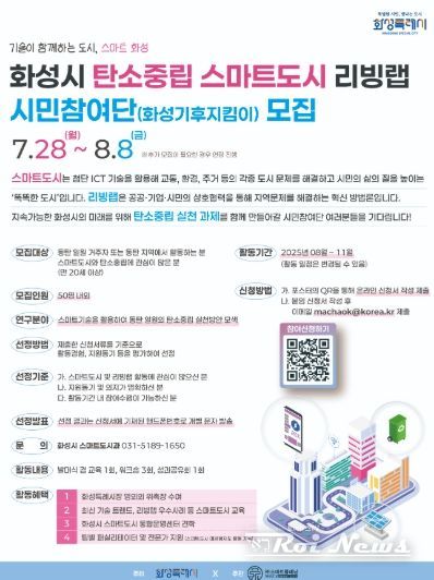 [ 로이뉴스(Roi News) 이지수 기자 ] 화성특례시가 8월 8일까지 탄소중립 스마트도시 리빙랩 시민참여단 ‘화성기후지킴이’를 모집한다.