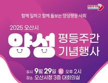 [ 로이뉴스(Roi News) 이지수 기자 ] 오산시는 오는 9월 29일 오후 2시, 오산시청 3층 대회의실에서 ‘2025년 양성평등주간 기념행사’를 개최한다고 밝혔다. 이번 행사는 “모두가 존중받는 성평등 사회, 모두가 행복한 오산”을 주제로 양성평등의 의미를 되새기고 시민이 함께 소통하며 즐길 수 있는 프로그램으로 진행된다. 행사는 1부와 2부로 나뉘어 열린다. 먼저 1부에서는 양성평등 실천 유공자에 대한 표창이 수여되고 이권재 시장이 직접 축사를 전한다. 이어지는 2부에서는 ‘양성평등 소통 힐링 토크쇼’가 진행되며, 개그우먼 출신으로 육아맘 힐링콘서트 ‘투맘쇼’에서 활동 중인 조승희와 KBS 개그콘서트 ‘소통왕 말자 할매’ 코너로 잘 알려진 김영희가 출연한다. 두 사람은 ‘동갑이몽’이라는 주제를 통해 양성평등에 관한 이야기를 쉽고 재미있게 풀어내며 시민과 자유롭게 소통할 예정이다. 오산시 관계자는 “이번 행사가 양성평등의 가치를 확산하고 성평등한 사회 분위기를 조성하는 계기가 되길 바란다”며, “시민들의 많은 관심과 적극적인 참여를 부탁드린다”고 말했다.