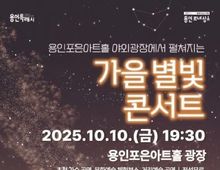 [ 로이뉴스(Roi News) 이지수 기자 ] 용인문화재단은 오는 10월 10일 오후 7시 30분, 새롭게 단장한 용인포은아트홀 야외광장에서 ‘가을 별빛 콘서트’를 개최한다. 이번 공연은 가을밤의 정취 속에서 시민들에게 특별한 추억을 선사하고, 용인의 대표 광장형 축제를 알리기 위해 마련됐다. ‘가을 별빛 콘서트’에는 가수 거미, 유리상자 이세준, 힙합 아티스트 행주·마린·블랙나인, 그리고 소프라노 정나리가 출연해 대중음악·클래식·힙합을 아우르는 다채로운 무대를 선보일 예정이다. 이번 공연은 무료로 진행되며, 사전 댓글 이벤트를 통한 예약석(현재 마감)과 공연 당일 현장 선착순 입장석으로 운영된다. 현장 참여자는 오후 5시부터 대기 후 오후 6시부터 선착순 입장할 수 있으며, 돗자리석과 계단석 등 다양한 방식으로 자유롭게 관람할 수 있다. 특히 이번 ‘가을 별빛 콘서트’는 시민 참여형 현장 이벤트도 마련됐다. 입장객 1,800명에게는 별 모양 무드등이 기념품으로 증정되며, 공연 전에는 중계 카메라 이벤트를 통해 용인포은아트홀 공연 티켓이 제공된다. 본 공연에 앞서 오후 4시부터 예술교육 매개자 ‘아트러너’가