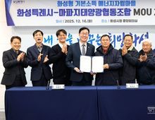 [ 로이뉴스(Roi News) 이지수 기자 ] 화성특례시는 16일 시청 중앙회의실에서 마파지태양광협동조합과 ‘화성형 기본소득 에너지자립마을 조성을 위한 업무협약(MOU)’을 체결했다. 이날 협약식에는 정명근 화성특례시장을 비롯해 김진원 마파지태양광 협동조합장 등이 참석해, 주민주도형 재생에너지 기반 에너지자립마을 조성사업의 추진에 상호 협력하기로 했다. 이번 사업은 국유지를 활용해 주민이 사업비 전액을 부담해 100% 주민주도형 ‘에너지자립마을’을 조성하는 경기도 최초 사례로, 재생에너지 수익을 마을 복지와 기본소득으로 연계하는 ‘화성형 기본사회’ 정책의 첫 시범 모델이다. 마파지태양광협동조합은 석포6리 주민 25가구가 공동 운영하는 협동조합으로, 사업주체로서 장안면 석포리 823번지 제방 국유지에 415kW 규모의 태양광 발전설비를 설치한다. 사업비는 총 5억 2천만 원으로 전액을 주민이 자부담한다. 시는 협약에 따라 인허가, 관계기관 협의, 제도 검토 등 사업 추진에 필요한 행정적·제도적 지원을 담당하고, 에너지자립마을이 안정적으로 운영될 수 있도록 정책적 기반 마련에 협력한다.