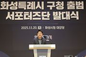 [ 로이뉴스(Roi News) 이지수 기자 ] 화성특례시의회는 20일, 화성시청 대강당에서 열린 ‘화성특례시 구청 출범 서포터즈단 발대식’에 참석해 시민과 함께하는 새로운 구청 체제 출범 준비의 의미를 공유했다. 이날 발대식에는 배정수 의장을 비롯해 시민 서포터즈단 등 총 330여 명이 자리했으며, 2026년 2월 화성특례시 4개 구청 신설을 앞두고 시민참여 기반을 다지는 공식적인 출범 행사로 마련됐다. 이번 행사는 ▲개회 및 국민의례 ▲구청 추진 경과 공유 ▲서포터즈 역할 안내 ▲구별 시민 대표 8명에 대한 위촉장 수여 ▲서포터즈단 소감 발표 ▲구청 체제 오리엔테이션 등으로 진행됐다. 특히 ‘2040 도시기본계획으로 보는 화성의 미래’, ‘도시비전 트렌드와 시민참여의 의미’ 등 전문 강연을 통해 향후 구청 체제가 지역행정과 생활에 가져올 변화가 소개되며 시민 호응을 얻었다. 배정수 의장은 “구청 출범은 시민이 체감할 수 있는 밀착형 생활행정의 본격적인 시작”이라며 “300명의 시민 서포터즈단이 지역의 요구와 비전을 현실적 정책으로 연결하는 핵심 주체가 될 것”이라며 축하했다. 한편,