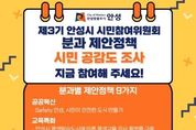 [ 로이뉴스(Roi News) 이지수 기자 ] 안성시는 오는 18일 오후 6시까지 시민참여위원회 분과별 제안 정책에 대한 시민 의견을 수렴한다고 밝혔다. 이번 시민 의견 수렴은 시민참여위원회 정책 발표회를 앞두고 진행하는 사전심사로, 분과별 제안 정책에 대한 시민 공감도를 확인하여 추후 현장심사 결과와 함께 최종 우수 제안 정책을 선정하는 데 활용된다. 7개 분과로 구성된 안성시 시민참여위원회는 소속 위원의 다양한 경험과 지속적인 논의를 바탕으로 안성시 시정에 반영할 정책 연구 활동을 추진해 왔으며, 이달 정책 발표회를 통해 각 분과에서 도출한 정책을 제안하여 그간 활동의 결실을 맺을 예정이다. 정책 발표회를 통해 각 분과에서 제안할 정책 주제는 ▲Safety 안성, 시민이 안전한 도시 만들기(공공혁신분과) ▲안성시 평생학습도시에 따른 평생교육 강사 플랫폼 구축(교육특화분과) ▲안성시 한우산업 탄소중립 모니터링 시스템 구축(미래농업분과) ▲안성시민을 위한 태양광발전 5개년 계획(생태도시분과) ▲전통문화 예술인들을 위한 창작공간 확보(문화도시분과) ▲안성, 사랑 흔들바위 관광지 조성(문화도시분과) ▲더불어 이동