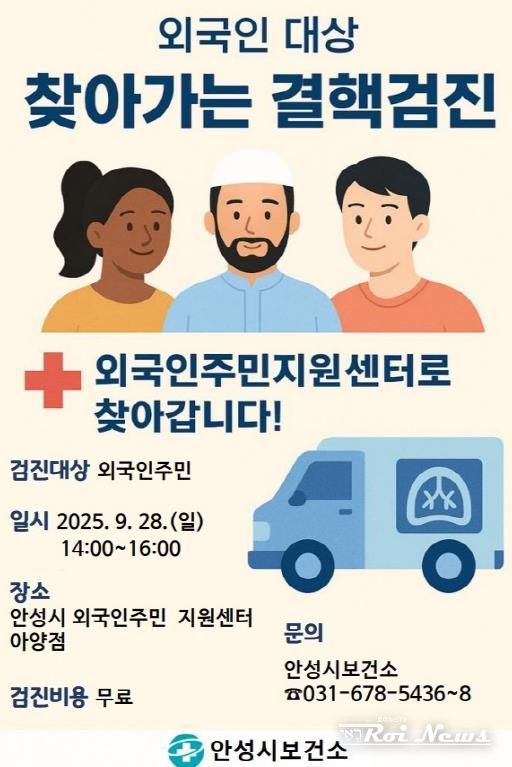 [ 로이뉴스(Roi News) 이지수 기자 ] 안성시보건소는 의료접근성이 낮은 외국인 주민에게 결핵 검진의 기회를 제공하기 위해 2025년 9월 28일(일) 오후 2시부터 4시까지, 외국인주민지원센터(아양점)에서 ‘찾아가는 결핵 검진’을 무료로 실시한다고 밝혔다.