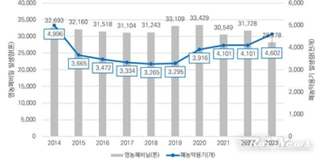 2023년 기준 경기도 영농폐기물 발생량은 영농 폐비닐이 약 3만 톤(93%), 폐농약 용기가 약 460만 개(94%)로 나타났다.