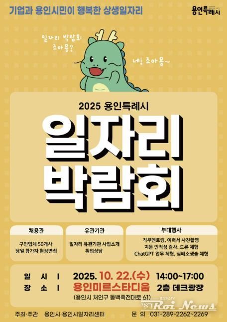 [ 로이뉴스(Roi News) 이지수 기자 ] 용인특례시는 오는 22일 오후 2시부터 5시까지 용인미르스타디움 2층 덱(deck) 광장에서 2025년 하반기 일자리박람회를 개최한다고 17일 밝혔다.
