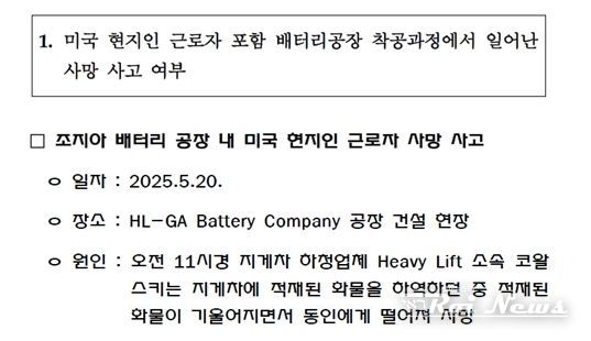 이 의원실이 확보한 현지 정보에 따르면, 해당 공장 건설 과정은 하청·재하청 구조로 인해 안전관리 체계가 크게 약화됐으며, 미국 산업안전보건청(OSHA)에 보고된 산업재해만 70건이 넘었다고 한다. 불법체류 노동자들이 추방을 우려해 신고하지 못한 경우까지 감안하면 실제 사고 건수는 훨씬 많을 것으로 추정된다.