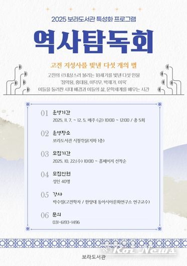 시 관계자는 “역사 탐독회는 전통·역사 특성화 도서관인 보라도서관의 대표 교양 교육 프로그램”이라며 “이번 강의가 시민들이 고전과 역사적 인물을 탐구하며 인문학적 소양을 확대할 수 있는 계기가 됐으면 한다”고 말했다.
