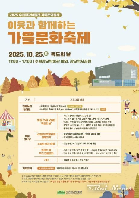 [ 로이뉴스(Roi News) 이지수 기자 ] 수원광교박물관은 독도의 날인 10월 25일 오전 11시부터 오후 5시까지 수원광교박물관 야외(광교역사공원)에서 ‘2025 수원광교박물관 가족문화행사–이웃과 함께하는 가을문화축제’를 연다.