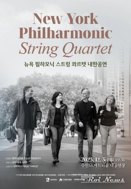 [ 로이뉴스(Roi News) 이지수 기자 ] 수원문화재단은 오는 12월 5일 금요일 오후 7시 30분, 수원SK아트리움 대공연장에서 ‘뉴욕 필하모닉 스트링 콰르텟 내한공연’을 개최한다.