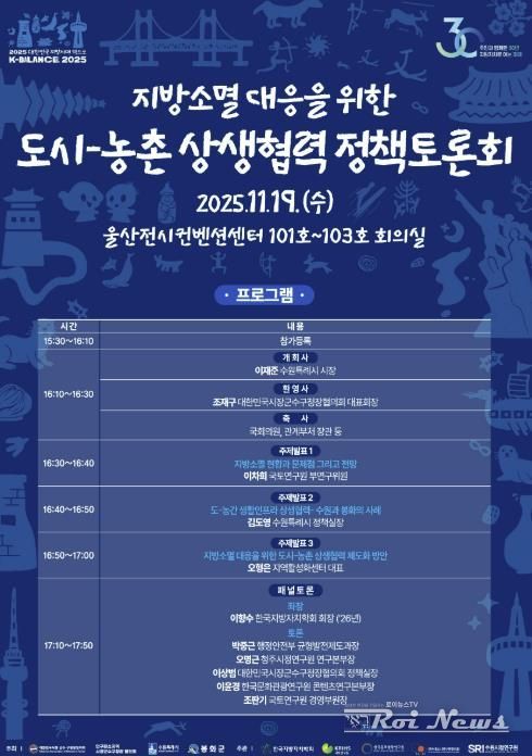 수원특례시(시장 이재준)는 11월 19일 오후 4시 울산전시컨벤션센터 1층에서 ‘지방소멸 대응을 위한 도시–농촌 상생협력 정책토론회’를 개최한다.
