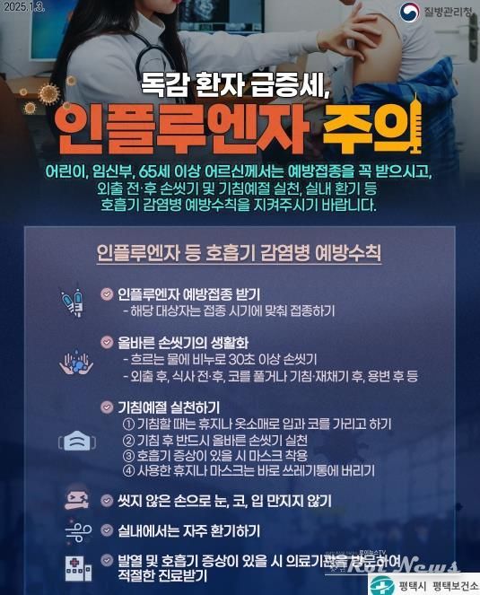 [ 로이뉴스(Roi News) 이지수 기자 ] 평택시는 이번 觝-觞절기 인플루엔자 유행이 예년보다 이르게 시작됨에 따라, 감염병 확산 방지를 위해 예방접종 참여 및 마스크 착용 등 기본적인 예방수칙 준수를 시민들에게 당부했다.