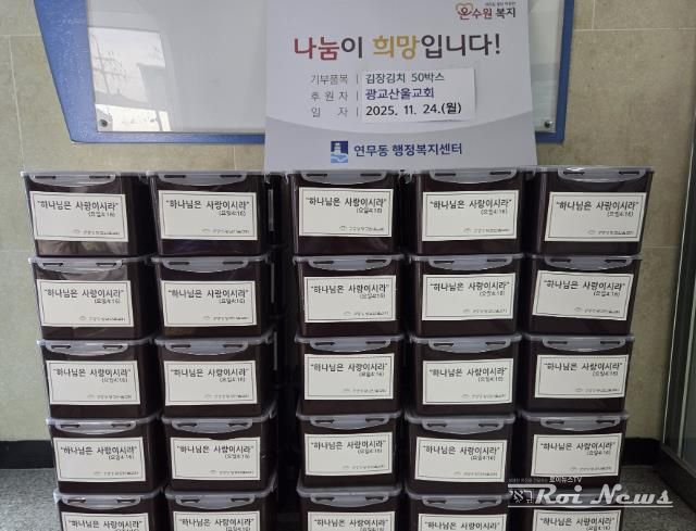 공순정 연무동장은 “추운 겨울을 앞두고 따뜻한 정성을 담아 김장김치를 기부해주신 광교산울교회에 깊이 감사드린다”며 “기부해주신 김치는 꼭 필요한 이웃들에게 소중히 전달하겠다”고 전했다.