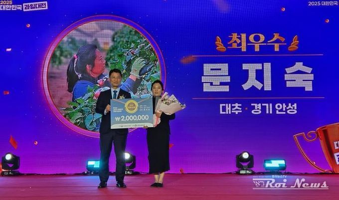 [ 로이뉴스(Roi News) 이지수 기자 ] 농림축산식품부 주최, 한국과수농협연합회 주관으로 하는 ‘2025 대한민국 과일산업대전 대표과일선발대회’에서 안성시가 2023년부터 대추부문에서 최우수상, 우수상을 수상하여 3년 연속 대추부문 최고자리에 올랐다. 수상자로 문지숙 대표가 최우수상(농림축산식품부장관상)으로 선정됐고, 조재곤 대표가 우수상(산림청장상)으로 선정됐다.