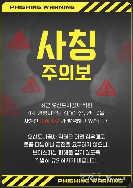 공사 관계자는 “오산도시공사는 어떤 경우에도 선입금·대금 선납, 중간 업체를 통한 대리 구매 지시, 계약 체결 전 납품 요청, 주거래은행 사칭 미팅 요구 등을 하지 않는다”며 “직원 실명을 도용한 전화나 문자로 선입금을 요구하는 모든 행위는 사기이므로, 의심스러운 연락이나 위조 문서가 확인될 경우 즉시 사실 여부를 공사에 문의해 달라”고 강조했다.