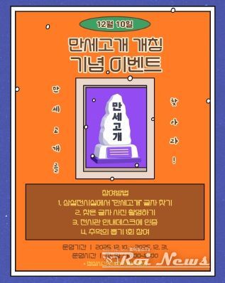 [ 로이뉴스(Roi News) 이지수 기자 ] 안성3.1운동기념관은 오는 12월 10일부터 12월 31일까지 만세고개 개칭을 기념한 시민 참여형 이벤트 “만세고개를 찾아라!”를 운영한다.