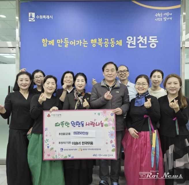[ 로이뉴스(Roi News) 이지수 기자 ] 지난 19일 한국무용반 강사 이송녀와 수강생들이 저소득 주민들을 돕기 위해 성금 50만 원을 원천동행정복지센터에 전달했다.