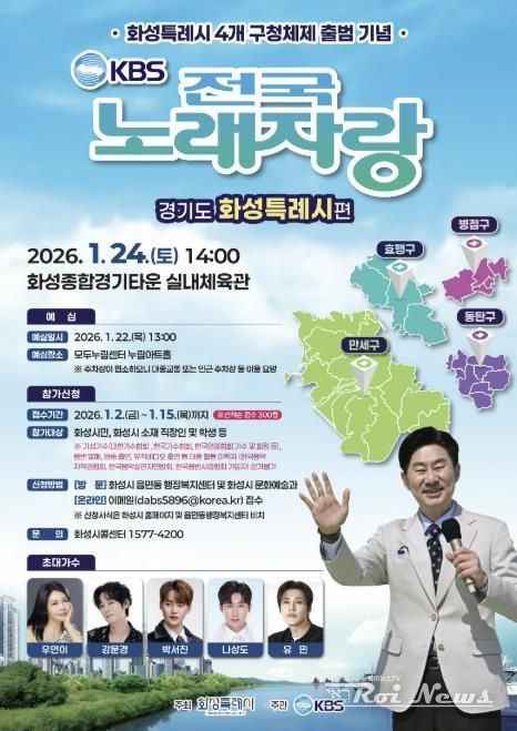 [ 로이뉴스(Roi News) 이지수 기자 ] 화성특례시는 다음 달 2일부터 15일까지 ‘KBS 전국노래자랑’ 화성특례시편 참가자를 모집한다고 24일 밝혔다.