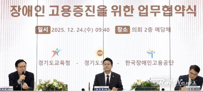 [ 로이뉴스(Roi News) 이지수 기자 ] 경기도교육청이 24일 경기도의회 예담채에서 경기도의회(의장 김진경), 한국장애인고용공단(이사장 이종성)과 함께 장애인 고용증진을 위한 업무협약을 체결했다.