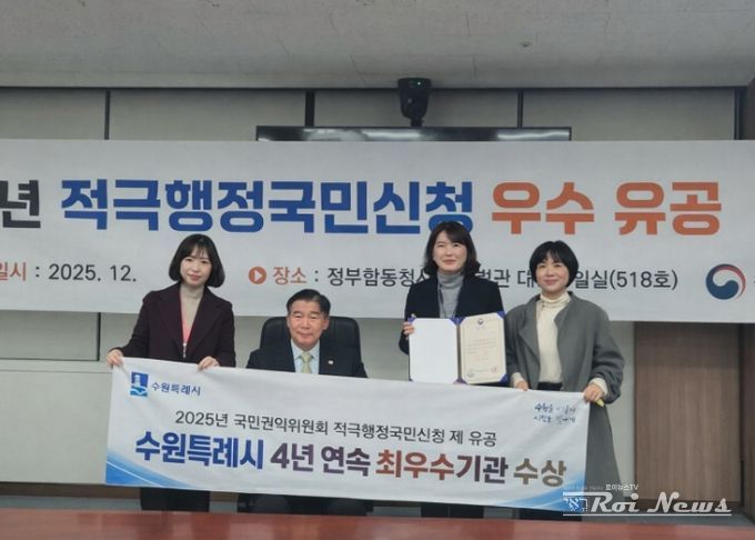 [ 로이뉴스(Roi News) 이지수 기자 ] 수원특례시가 4년 연속 ‘국민권익위원회 적극행정국민신청제’ 우수기관으로 선정됐다.